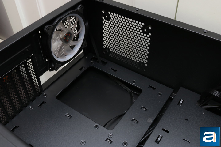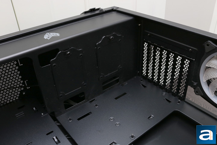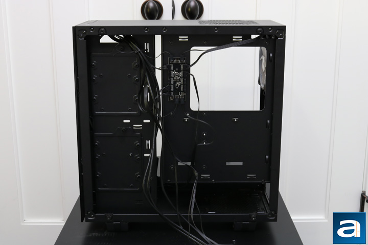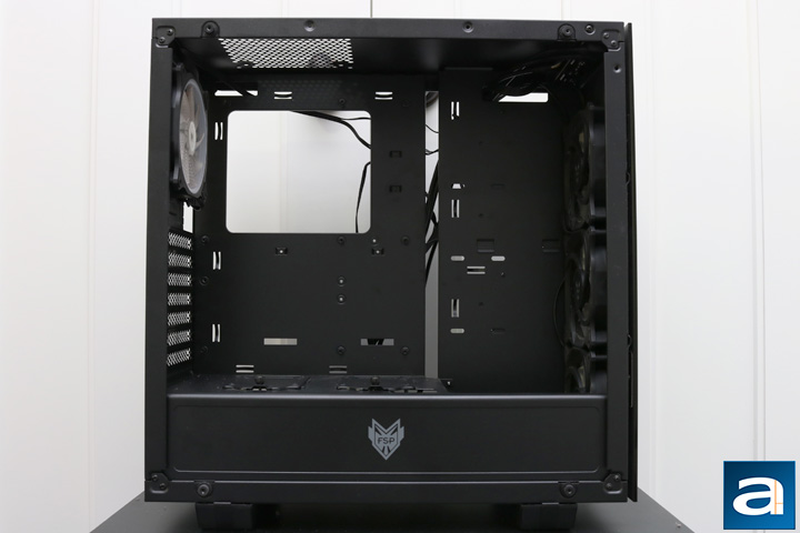The FSP CMT510 has a great open interior. Matching the outside, the black color is continued inside, which is crucial because of the tempered glass panels allowing one to see into the case. Everything is painted black; there are no contrasts within the case at all. Otherwise, the power supply chamber is almost entirely covered by a shroud. To the far right of the above picture, there is an open space, quite large, to allow for greater cooling capabilities. This is the only break in the shroud, otherwise there are no ventilation holes in an attempt to keep the temperature zones separate. However, the large gap might make that feat a little more difficult. Sitting comfortably on top of the shroud are two 2.5'' SSD mounts, each of which have their own cutouts for cables. A large vertical break in the case between the motherboard tray and the right side of the case allow for cables to be easily passed through to the front. The motherboard tray is also recessed a bit compared to the front, making it even easier for cables to be routed to the front. Having such a recession does mean there is also more room for cables on one side of the case.
