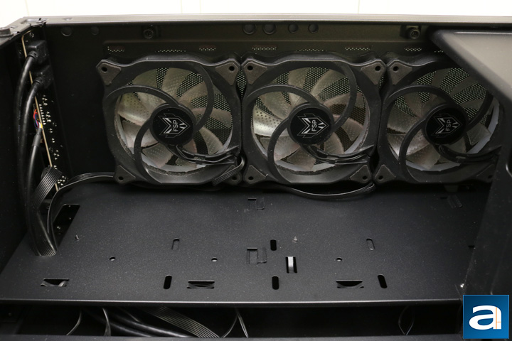 The cooling capabilities of the FSP CMT510 are quite good. There is enough room for three 120 mm fans in the front. This also allows for up to a 360 mm radiator to be installed. This will provide more than enough cooling for enthusiasts. There are three pre-installed fans that are also RGB, which is controlled through the button on the front I/O. The colors work in conjunction with the rear mounted fan. At the front bottom of the case, you can also install another fan that would most probably blow air upward, however, if a 360 mm radiator is installed then a fan cannot be installed along the bottom. There is also a magnetic dust filter in the front of the fans that is made of quality materials, but is not as fine as the dust filters along the bottom of the CMT510. This means more dust can enter the case, requiring more frequent cleaning. Otherwise, there is not that much room for air to be pulled in at the front because of the tempered glass panel. There is less than 10 mm of room to pull air into the case. For the most part, there should not be massive changes in temperatures inside the case; I have not tested how much the airflow is actually obstructed by the glass though.