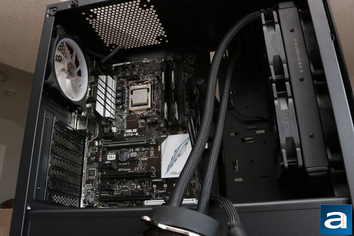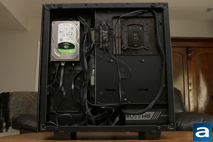 I did not do the best as I could have done with cable management, but the FSP CMT510 definitely has the tools necessary to ensure a clean final look. There are plenty of loops to tie cables down, and the power supply chamber has plenty of room for cables. FSP also includes a couple of zip ties to help in the process. The large break in the case between the hard drive mounts and the motherboard tray also makes it easy to pass cables through and organize them neatly. There is about 25 mm of space for cables on the back. The only improvement I could think of is to include Velcro straps to make it easier to tie cables down.