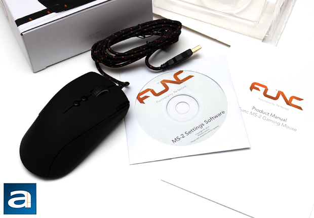Inside you will find some packing paper, which wraps the product in question, the Func MS-2. As with all of Func's packaging, they have kept a white and orange scheme, which looks clean and minimalist. Its logo is large and placed on the top left side, with the slogan "Functionality. Perfected", underneath. The model and item description is kept short and small. The front also shows the MS-2 "creeping" in from the side, which is another nice touch. Func has always displayed attention in the packaging, and the MS-2 is another prime example of this. The front is also a flap held closed by magnets. Opening this flap reveals the mouse itself in a plastic shell, which allows you to see the size and feel it too. The other side of the flap also has many paragraphs about Func itself. The backside of the box has a few features and specifications, of which I will list below: