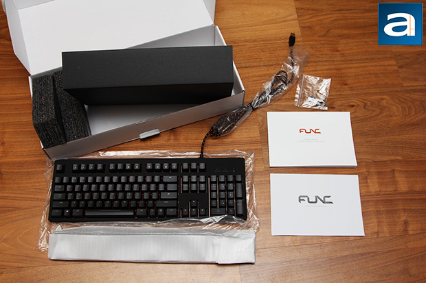 With "Functionality. Perfected." as the company slogan, you would expect their products to focus a lot on its... well, functionality. The way I see it, this functionality statement is clearly portrayed even before I opened the package, but was further reinforced when I took a look inside. Out of the box, you will receive everything you will need, and nothing more. Securely clipped between two Styrofoam brackets is the Func KB-460 keyboard itself contained in a clear plastic bag, while its detachable wrist rest is wrapped inside a separate piece of white foam. Two plastic clips used to attach the wrist rest to the keyboard are located inside a resealable plastic bag; more on this later. On the product literature side, a color manual is included, along with a separate sheet of paper telling you where to download the software. A driver CD is nowhere to be found, but this is okay. If you don't have internet, please send me an email, and let me know how you came across this review.