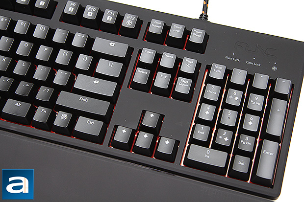 Once you turn off the lights and activate the Func KB-460's backlit keys, the keyboard really shines -- no pun intended. The KB-460 features full key backlighting, but in only one color, and that is red. Backlight intensity can be adjusted on the fly by hitting the Function key along with the labeled '8' and '2' buttons on the number pad to increase or decrease the level, respectively. The backlight can be turned off completely, or activated in three different brightness levels. If you increase the brightness to maximum, and increment it up once more, the Func KB-460 will enter into a special backlight mode, where the backlight will fade in and fade out continuously. I am a big fan of fully backlit keyboards, and I am happy Func designed the KB-460 with this feature. On the other hand, while I do not expect SteelSeries Apex kind of light show, a few more user configurable color options would be nice. My primary concern is red light is the most attention grabbing color, so some users may find the KB-460 particularly distracting at night. Obviously, you can turn off the backlight at night, but what's the point?