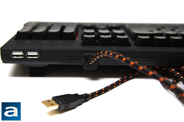 At the back of the Func KB-460 is the USB cable lead out. It comes out biased to the right, and is not detachable. This nicely braided cable features a Func-orange texture to it, and extends 1.8m in length to connect to your computer via a gold plated USB connector. Two USB 2.0 ports are present at the back. When we bring about the question of whether gold plated connectors are actually useful or not, let's just say if it was the actual pins, then possibly -- since gold offers better conductivity than other metals. This theoretically establishes a better connection with your computer, but on a digital signal level, we must understand it is a discrete one or zero; so if anyone tells you they can tell the difference, you can definitely defeat their theory with a double blinded test. Additionally, if you are referring to the gold part of the connector you see on the plug, I would like to point out it actually does not make any physical contact electrically with your computer. In other words, it is nice to have, and it is pretty to look at, but it is not anything significant on a practical level.