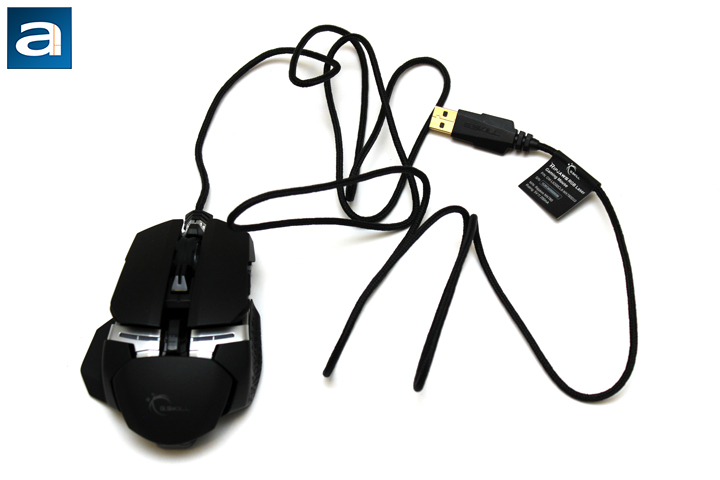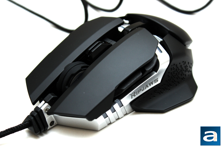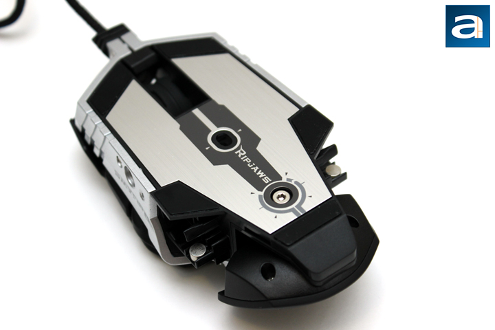 In addition to the buttons, there are some LED lighting areas shown in the picture. This includes the three etched lines on both sides by the "Ripjaws" moniker, scroll wheel, and valley between the buttons and the palm rest. The back palm rest also has an illuminated area, which displays G.Skill's logo. All of these lights are RGB, and therefore can be changed to any of the 16.7 million colors using G.Skill's software.
