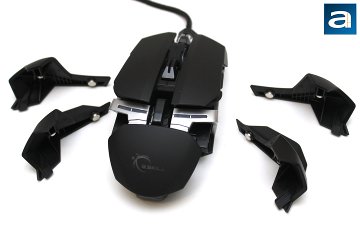 As I have mentioned multiple times before, G.Skill has allowed for more customization than most mice manufacturers. The sides are completely modifiable to either fit better for left-handed or right-handed users. In addition, users could just keep it symmetrical with either thin or thick side grips. These plastic grips are held to the mouse with two neodymium magnets, and they attach securely into place. I am happy to report these grips have never accidentally fallen out of place, and they actually require a bit more force to remove. Secondly, there is one empty slot on each side to put your included weights to vary the feel of the mouse. Finally, the back palm rest area can be adjusted in height, depending on your hand comfort. This is adjusted by tightening or loosening a bolt under the mouse with the included hex tool. All of these options are much appreciated, and generally make for a better fit. It is not necessarily a new idea, but it definitely makes for a better experience.