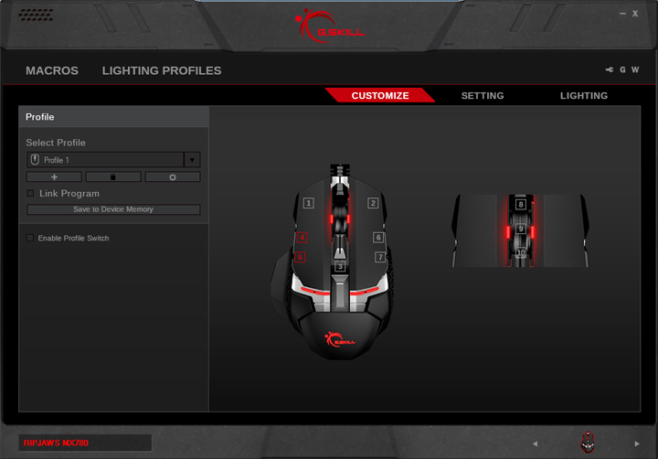 First of all, the "Customize" page allows you to select the different functions for each key. As I have mentioned, you can change practically any key to do anything, whether it is a macro combination, or even a combination of keyboard shortcuts. Thus, there are a total of ten different keys you can change. At the very top, there are two tabs called "Macros" and "Lighting Profiles". The Macros tab is pretty obvious, as users can configure different macros to be set on the "Customize" page. Likewise, "Lighting Profiles" allow users to set different profiles for either breathing or a cycle through of colors. The "Setting" page is where users can configure polling rates, double click speeds, pointer speeds, scroll speeds, liftoff range, and DPI stages. As aforementioned, the DPI can be changed from 100 DPI all the way to 8200 DPI in increments of one. Finally the "Lighting" page is where users can change each zone of lights. The scroll wheel, G.Skill's logo, and the side etched lights are all each their own "zone", while the four LEDs in the valley can be set to their own color. However, if you choose to do breathing or the rainbow wave, the four LEDs act as a single zone. Here, you can also adjust the brightness of the lights, as well as disable the lighting altogether.