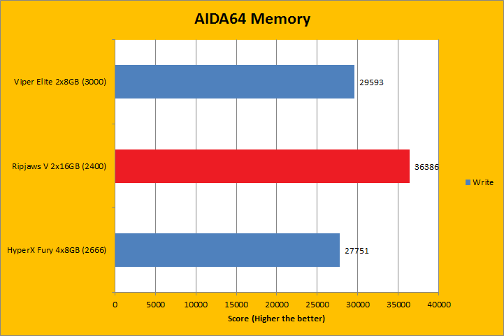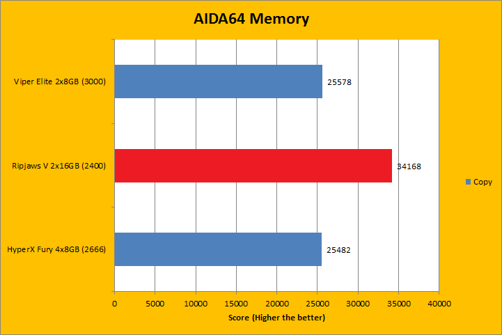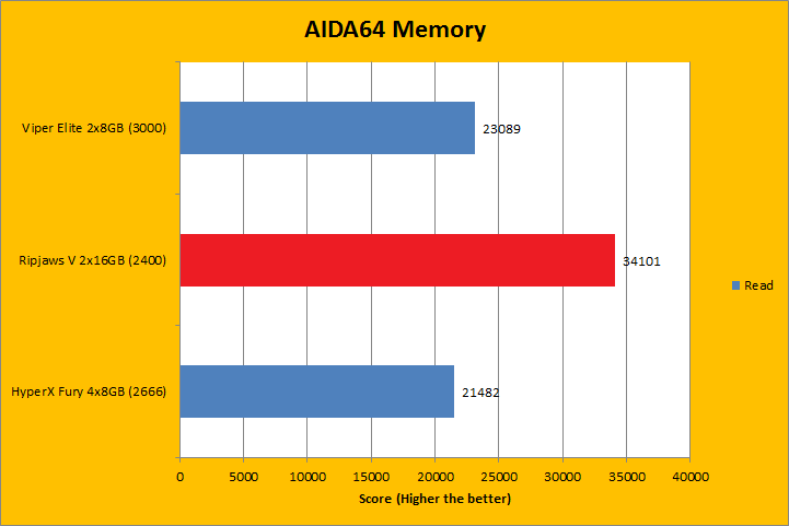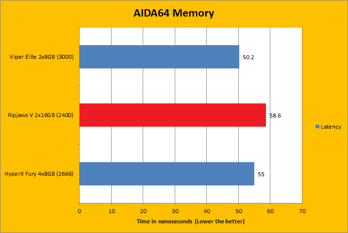 AIDA64's synthetic memory tests are the one next up to produce results for our review today. In pretty much all the benchmarks, we can see higher memory bandwidth RAM kits are generally favored -- whether it is the Copy, Write, or Read results. However, an even bigger favor was handed out to higher density modules, which, in the case of the G.Skill Ripjaws V 2x16GB kit, despite being only DDR4-2400, handily won every bandwidth benchmark. Operating at DDR4-3000, the Patriot Viper Elite PC4-24000 2x8GB came in at second place for every test, because first place went to the G.Skill Ripjaws V 2x16GB set, while third place went to the lower frequency Kingston HyperX DDR4-2666 kit. This was pretty much what we have been expecting all along.