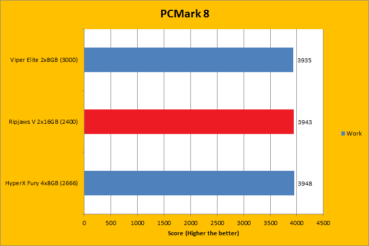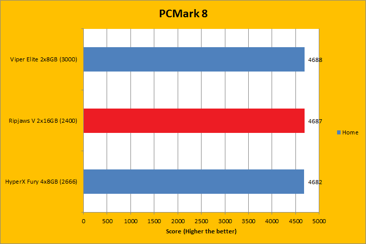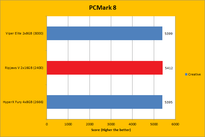 PCMark 8 is the latest revision of the popular full system benchmark from Futuremark. It tests five general categories, which includes Home, Creative, Work, Storage, and Applications. In order to run the Applications benchmark, you must have Adobe Creative Suite and Microsoft Office installed. We do have those programs here at APH Networks, but this is a test platform, so we do not have extra licenses to go around just for benchmarking purposes. As such, I left them out of my results. I did not run the Storage suite, because we are testing a memory kit here. With PCMark 8 fired up, all tests were run in Conventional mode. All tested RAM came out to be extremely close. Even if we were to go by absolute values, there was no clear winner, even if the G.Skill Ripjaws V F4-2400C15D-32GVR 2x16GB was the slowest rated memory of the bunch. Do keep in mind the differences were virtually negligible.