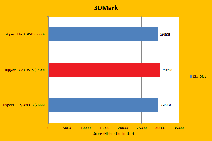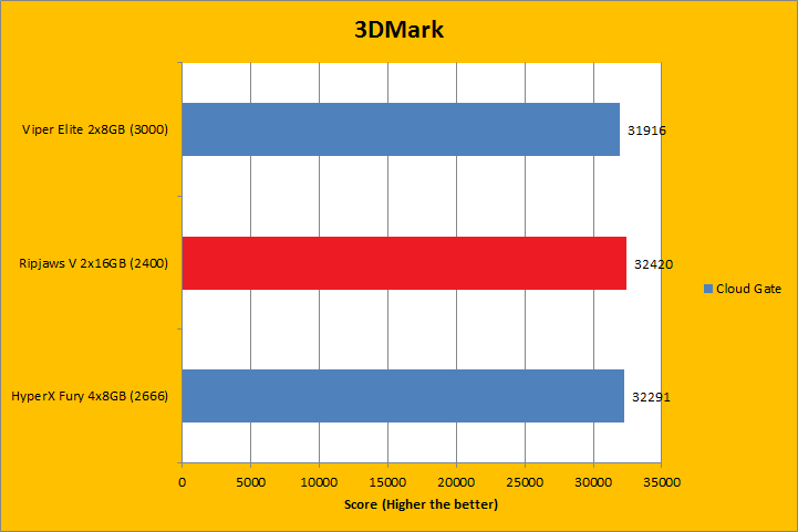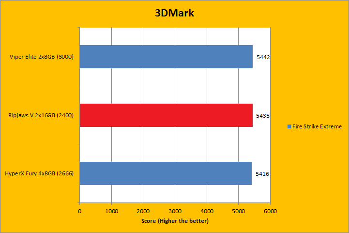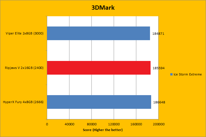 Like Futuremark's PCMark 8 benchmarking suite, 3DMark is yet another favorite among enthusiasts and reviewers alike. In fact, it has been part of the APH Networks' battery of standard benchmarks since the very beginning. The latest iteration of 3DMark is available in four presets. This includes Fire Strike Extreme, Sky Diver, Cloud Gate, and Ice Storm Extreme; each in decreasing order of GPU dependency. To give our test platform a little more comprehensive results, I enabled the Extreme option in our tests, where possible. As you can see in our graphs above, the DDR4-2400 G.Skill Ripjaws V F4-2400C15D-32GVR 2x16GB remained generally consistent with the pack. Bandwidth played a small role here, and it was interesting how the Ripjaws V, despite having the lowest bandwidth, won two of the four tests, and came up a hair behind everyone else in the rest.