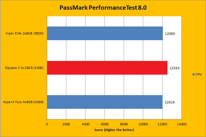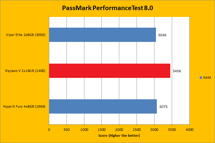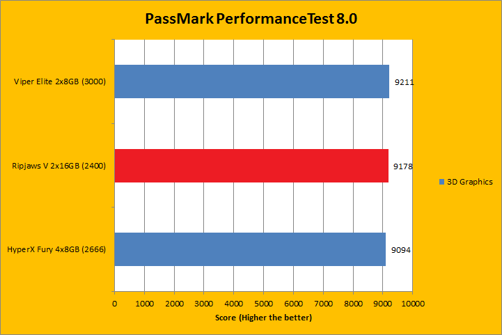 We run PassMark PerformanceTest 8.0 to evaluate four different areas of our system; coming down to the CPU, RAM, 2D Graphics, and 3D Graphics. It takes a somewhat different approach in obtaining results compared to other programs, which is why we like to use it, haha. PassMark Performance Test 8.0's memory benchmarking tool is the only test in our setup that takes memory capacity into account, but it did not seem to account for anything above 16GB. Usually, doubling the RAM will increase the score by about one and a half times, but the 32GB kits here did not rank higher compared to the 16GB kits for its capacity only. Instead, the Ripjaws V 2x16GB won on density, just like it did in the AIDA64 memory tests. Other than that, most of the results were extremely close to each other, with the F4-2400C15D-32GVR winning all but the 3D Graphics test.