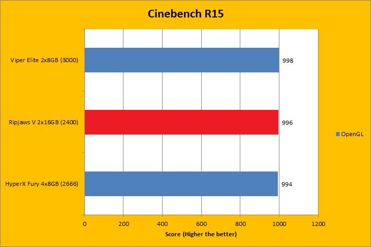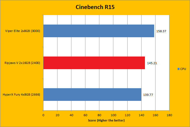 Cinebench R15 is separated into two tests: One tests the CPU image rendering performance, while the other benchmarks the OpenGL video rendering performance. Obviously, having a fast processor and a powerful video card, respectively, will play a much more significant role in determining these scores, but that does not mean RAM does not do anything at all to contribute to these results. As you can see in our charts above, the G.Skill Ripjaws V F4-2400C15D-32GVR 2x16GB did well in both tests; scoring second in both the CPU and OpenGL benchmarks. If you have a Core i5, you will not see such a big variance in the results in relation to memory bandwidth. A Core i7, however, can take advantage of faster memory, as it did in this case.