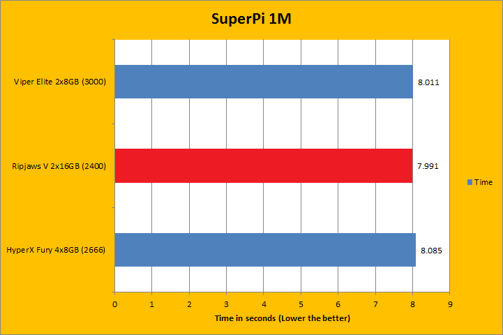 We have always included SuperPi in our benchmark results, because it is a quick and dirty run that always proves to be interesting. It is neither the fastest way to calculate Pi, nor is it the most challenging. But being an enthusiast at heart, this program has always provided interesting results for showing off your overclocking prowess at your favorite online forum. This time around, the G.Skill Ripjaws V F4-2400C15D-32GVR 2x16GB won by a small fraction of a second against the others; ironically with the lowest bandwidth, but highest density once again. First place is always a great place to be, especially considering it was being stepped up against DDR4-2666 and DDR4-3000 kits.
