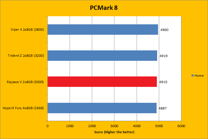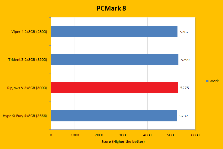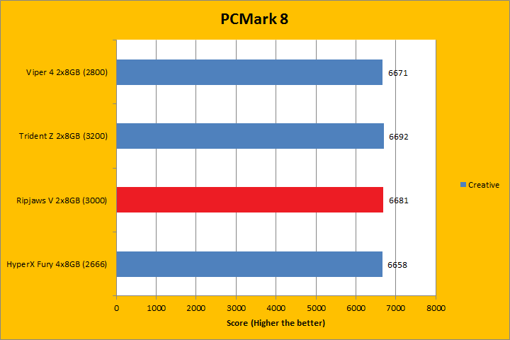PCMark 8 is the latest revision of the popular full system benchmark from Futuremark. It tests five general categories, which includes Home, Creative, Work, Storage, and Applications. In order to run the Applications benchmark, you must have Adobe Creative Suite and Microsoft Office installed. We do have those programs here at APH Networks, but this is a test platform, so we do not have extra licenses to go around just for benchmarking purposes. As such, I left them out of my results. I did not run the Storage suite, because we are testing a memory kit here. With PCMark 8 fired up, all tests were run in Accelerated mode, where available. All tested RAM came out to be extremely close. If we were to go by absolute values, however, higher bandwidth memory scored marginally higher, so the G.Skill Ripjaws V F4-3000C15D-16GVR 2x8GB at DDR4-3000 had some advantages except for the first test. Do keep in mind the differences were virtually negligible.