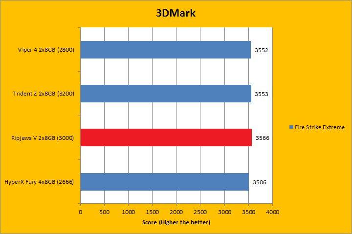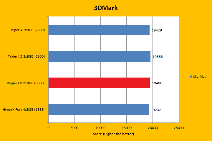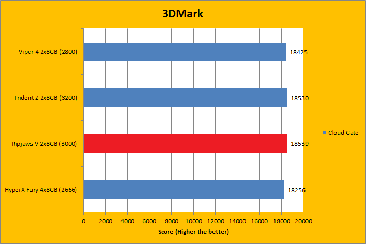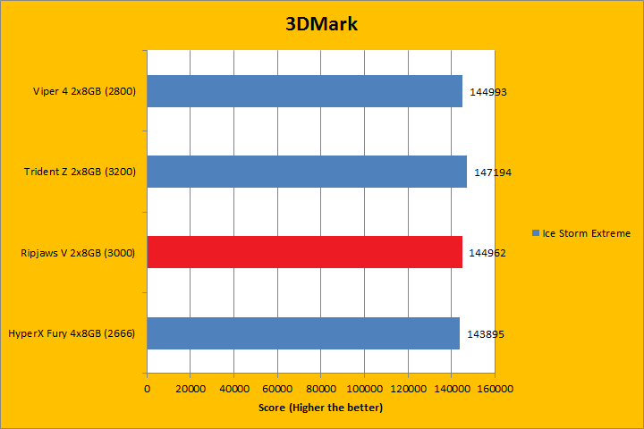 Like Futuremark's PCMark 8 benchmarking suite, 3DMark is yet another favorite among enthusiasts and reviewers alike. In fact, it has been part of the APH Networks' battery of standard benchmarks since the very beginning. The latest iteration of 3DMark is available in four presets. This includes Fire Strike Extreme, Sky Diver, Cloud Gate, and Ice Storm Extreme; each in decreasing order of GPU dependency. To give our test platform a little more comprehensive results, I enabled the Extreme option in our tests, where possible. As you can see in our graphs above, the DDR4-3000 G.Skill Ripjaws V F4-3000C15D-16GVR 2x8GB remained generally consistent with the pack. Bandwidth played a small role here, so although most of the tests ended up being statistical ties, the G.Skill Ripjaws V came through at the upper end of the spectrum in all of them. including a couple of wins.
