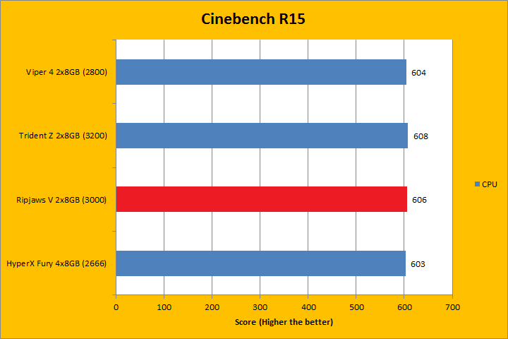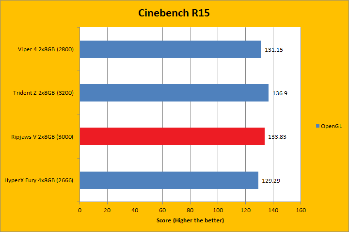 Cinebench R15 is separated into two tests: One tests the CPU image rendering performance, while the other benchmarks the OpenGL video rendering performance. Obviously, having a fast processor and a powerful video card, respectively, will play a much more significant role in determining these scores, but that does not mean RAM does not do anything at all to contribute to these results. As you can see in our charts above, the G.Skill Ripjaws V F4-3000C15D-16GVR 2x8GB did well in both tests; holding its own against faster and slower kits in the CPU and OpenGL results. That said, it is important to point out all of the tested kits came out extremely close to each other, despite frequency variance of approximately 534MHz between the fastest and slowest.
