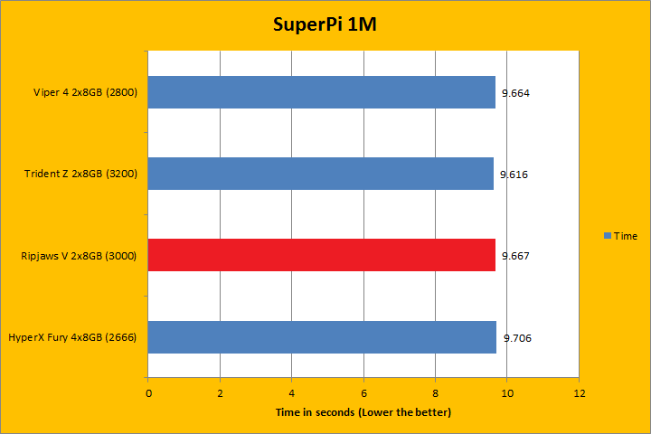 We have always included SuperPi in our benchmark results, because it is a quick and dirty run that always proves to be interesting. It is neither the fastest way to calculate Pi, nor is it the most challenging. But being an enthusiast at heart, this program has always provided interesting results for showing off your overclocking prowess at your favorite online forum. This time around, the G.Skill Ripjaws V F4-3000C15D-16GVR 2x8GB lost by a small fraction of a second against the fastest, and barely lost to the second place Viper 4.