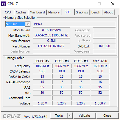 A screenshot of the memory tab in CPU-Z with G.Skill's Trident Z F4-3200C16D-16GTZ 2x8GB installed. The SPD timings table in CPU-Z reads standard JEDEC specifications programmed into the memory, as well as Intel XMP data for running the memory at various speeds. Using the latest BIOS revision, our Gigabyte GA-Z170X-UD5 motherboard used for testing had no issues detecting and working with the G.Skill RAM right out of the box. The G.Skill Trident Z F4-3200C16D-16GTZ 2x8GB retails for approximately $130 at press time.