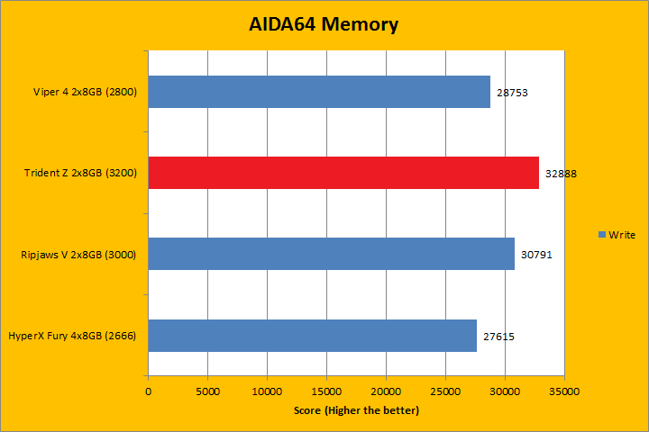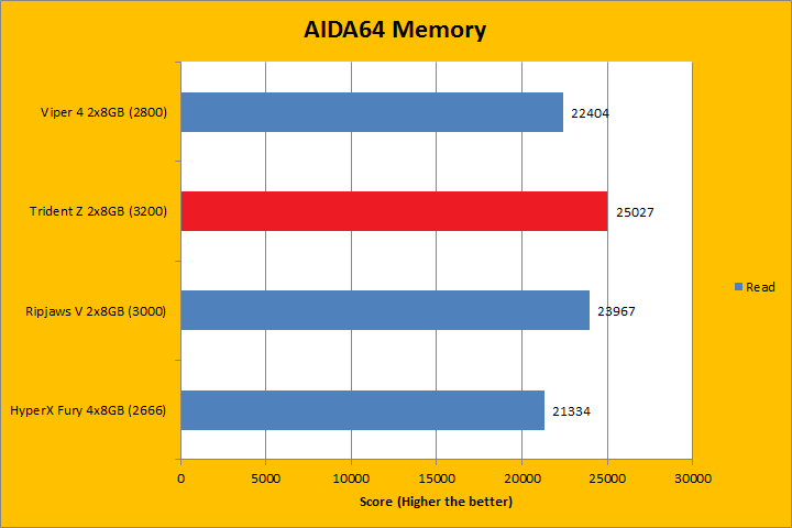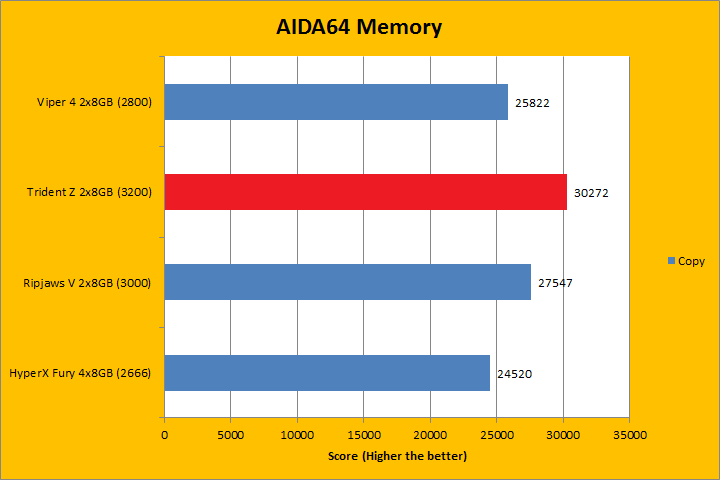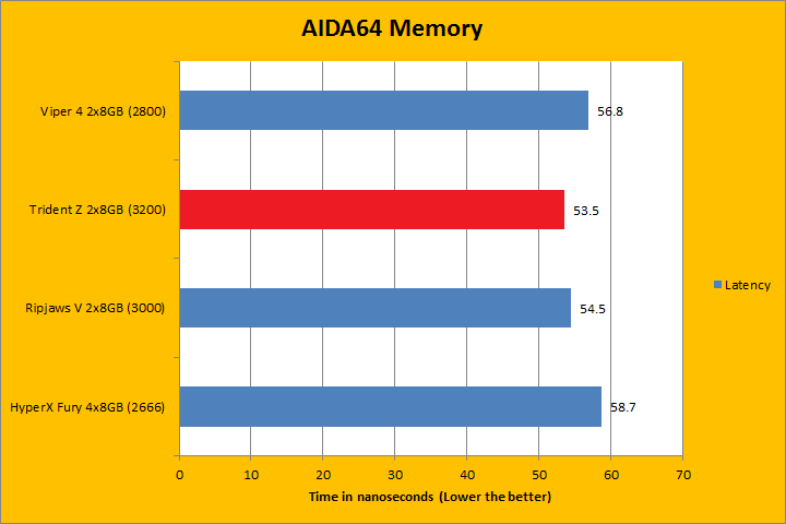 AIDA64's synthetic memory tests are the one next up to produce results for our review today. In pretty much all the benchmarks, we can see higher memory bandwidth RAM kits are generally favored -- whether it is the Copy, Write, or Read results. This was probably the most unsurprising thing ever, consider the name of this benchmark does, in fact, reflect what was tested. Operating at DDR4-3200, the G.Skill Trident Z F4-3200C16D-16GTZ 2x8GB won every single test -- some with larger margins than others -- as it was the fastest tested memory kit of the bunch, with the rest ranging from DDR4-2666 to DDR3-3000. This was pretty much what we have been expecting all along.