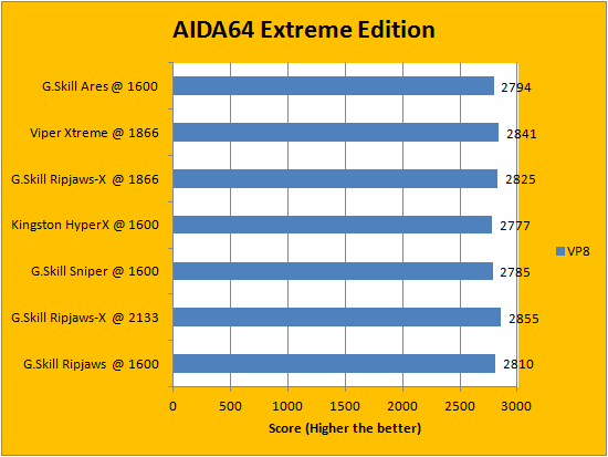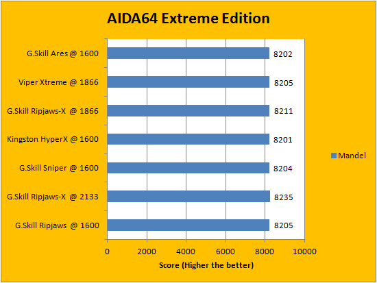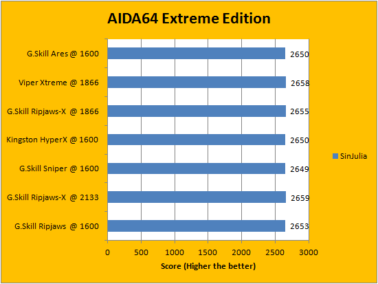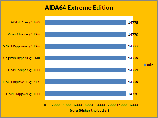 Usually, AIDA64's FPU benchmarks are the least exciting of all when writing a RAM review. This is because the way results are obtained is usually highly dependent on the tested processor; so much to an extent that the outcome is practically irrelevant to the speed or latencies of the installed memory modules. Once again, our revised benchmarking platform featuring a Core i5-2405S processor (We used to test all our RAM kits with a Core i3-2120) showed very consistent results using the G.Skill Ares F3-1600C8Q-16GAB 4x4GB against other memory kits.