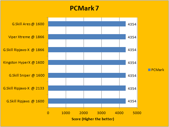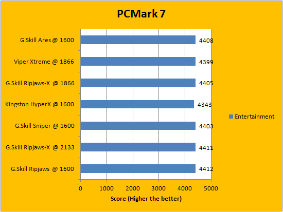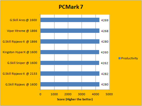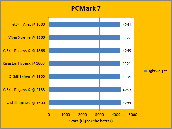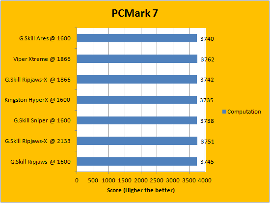 PCMark is a favorite benchmarking program for PC enthusiasts and reviewers alike, because it provides a very easy way to measure performance of different computers. It evaluates a system from seven perspectives (We only included the first six results, since the HDD test is not very relevant to a RAM review), and can be considered a synthetic real life benchmark. In the latest version of PCMark, Futuremark claims they have brought down the variance of each run to ensure accuracy of their benchmarks, and with a relatively low margin of error in mind, all tested RAM came out to be extremely close. Spots are often traded, so no clear leader can be defined.