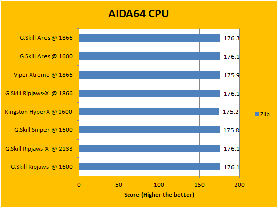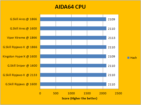 As always, our first set of benchmark results presented on the table are data obtained using AIDA64 CPU tests, formerly known as EVEREST. Performance is quite consistent across the board; where performance of the memory kits are mostly separated by their respective performance categories. Traditionally, memory frequency has a much higher effect than capacity and latencies, as shown in our graphs above. With the G.Skill Ares F3-1866C10D-16GAB 2x8GB running in standard dual channel mode, there were no surprises when it comes to the test results -- other than the AES benchmark seen above.