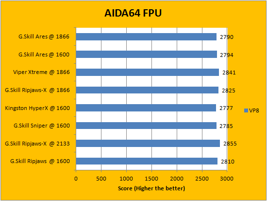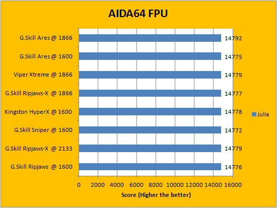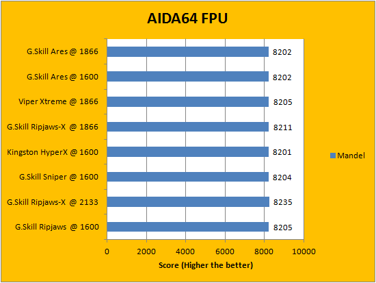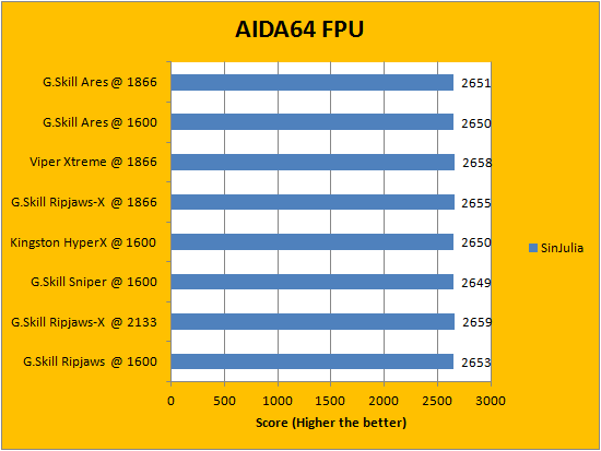 Usually, AIDA64's FPU benchmarks are the least exciting of all when writing a RAM review. This is because the way results are obtained is usually highly dependent on the tested processor; so much to an extent that the outcome is practically irrelevant to the speed or latencies of the installed memory modules. Once again, our revised benchmarking platform featuring a Core i5-2405S processor we have deployed since July showed very consistent results using the G.Skill Ares F3-1866C10D-16GAB 2x8GB against other memory kits.
