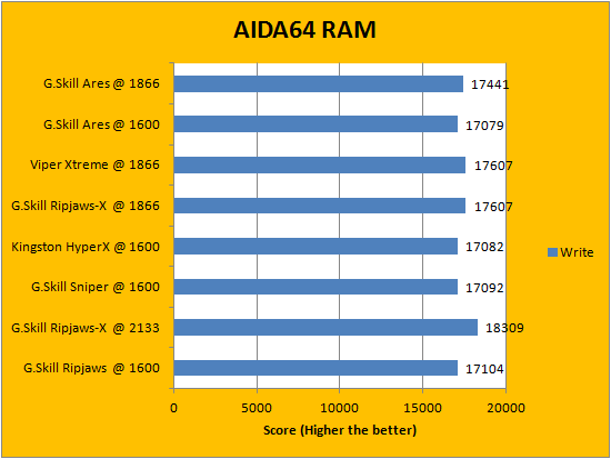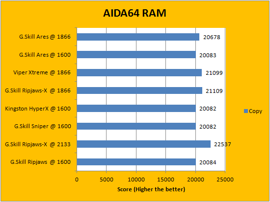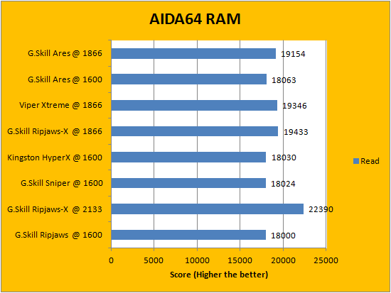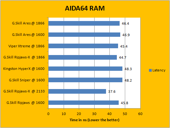 AIDA64's synthetic memory tests are the one next up to produce results for our review today. In pretty much all the benchmarks, we can see that higher memory bandwidth RAM kits are generally favored -- whether it is the Copy, Write, or Read results. This is probably the most unsurprising thing ever, consider the name of this benchmark does, in fact, reflect what is tested. Operating at DDR3-1866, it was not surprising how the G.Skill Ares F3-1866C10D-16GAB 2x8GB are all within a hair of other memory sets operating at the same frequency. Once again, enjoy the graphs above at your own pleasure.