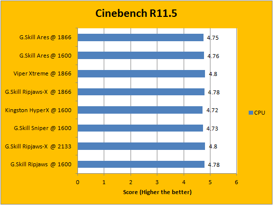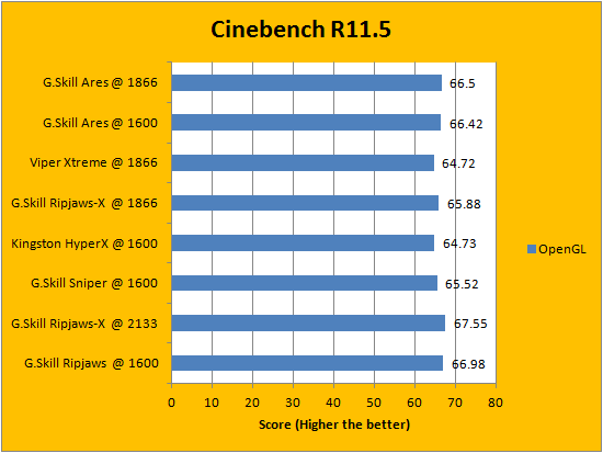 Similar characteristics can be noticed in our Cinebench results; higher bandwidth memory benefited to a very small extent, as shown in our graphs above. For the CPU test results, processor horsepower played a much more significant role in contributing to the score. This probably does not come at a surprise to you. On the other hand, things are slightly different in the OpenGL benchmark; where memory speed did not make much difference, as latencies also contributed to this score.