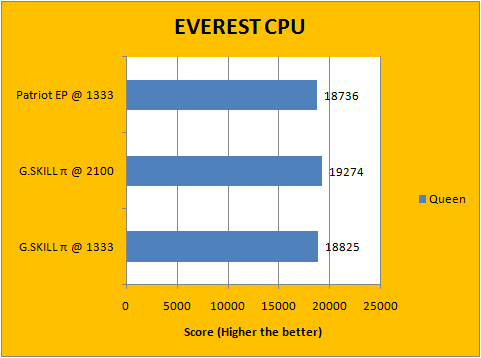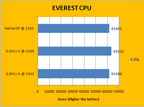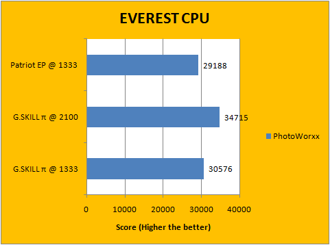 It is no surprise to us that G.SKILL's Pi series memory performed better than our reference Patriot Extreme Edition RAM running at roughly stock speeds, since the processor is also overclocked by 70MHz under the same conditions. EVEREST's PhotoWorxx test benefited more significantly than others with the increased memory bandwidth, with a posted gain of +13.5%. When we ran it at DDR3-1333 along with the reference Patriot Extreme Edition memory configured to identical frequencies, it ended up a statistical tie.