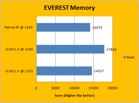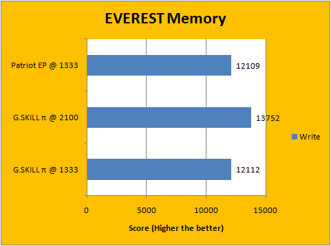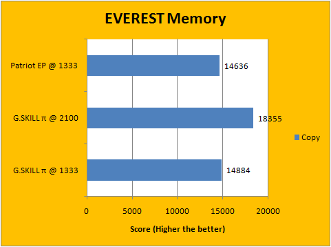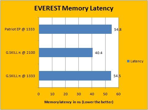 Here is where the G.SKILL F3-17600CL7D-4GBPIS 2x2GB dual channel kit posted significant gains at full throttle, even with the 2.6% increased clock speed advantage from the CPU standardized in mind. A gain of 22.4%, 13.5%, and 23.3% over the same pair of memory at DDR3-1333, in conjunction with the CPU's 210MHz base clock, is recorded and displayed on our charts above for read, write, and copy results, respectively -- significantly more than the compensated CPU clock speed is able to provide. The higher memory bandwidth between the processor and memory contributed significantly to our synthetic memory benchmarks displayed above. Tested memory latency of G.SKILL's F3-17600CL7D-4GBPIS from EVEREST is 54.5ns at DDR3-1333 BLCK 133, as compared to 40.4ns at DDR-2100 BLCK 210.