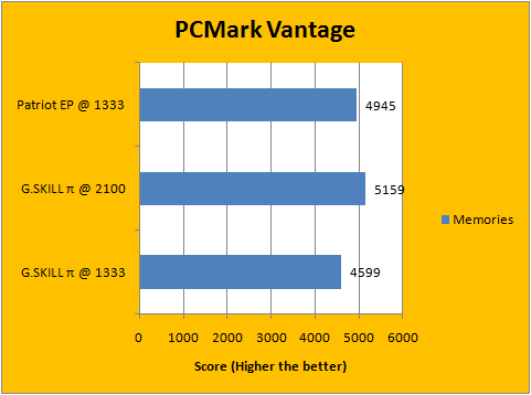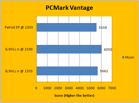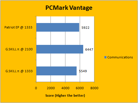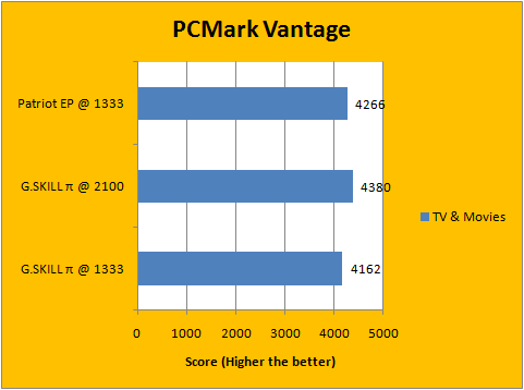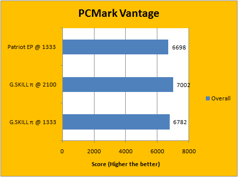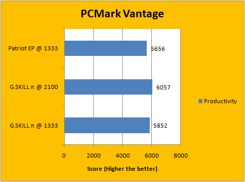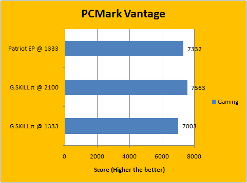 I was fairly surprised by the mixed results between PCMark's Vantage tests with regards to the performance of G.SKILL's F3-17600CL7D-4GBPIS kit running at 1333MHz -- the results were mixed between our tested RAM in question against the reference Patriot Extreme Edition memory. The delta function in scores generally had us come down to the logical conclusion that the differences are not significant. Having higher memory bandwidth on the G.SKILL F3-17600CL7D-4GBPIS with increased processor base clock posted noticeable performance gains over both kits running at 1333MHz, as shown in our graphs above. However, most of them were not significant enough to regard as an actual performance advantage in comparison to the 2.6% linear clock base adjustment threshold mentioned earlier in this review.