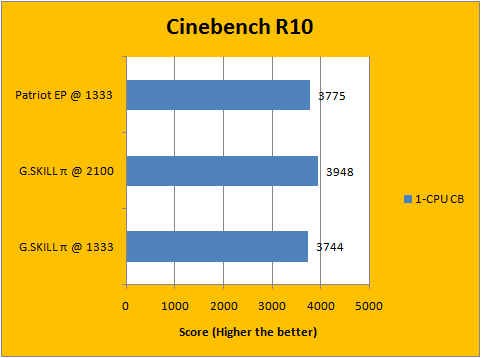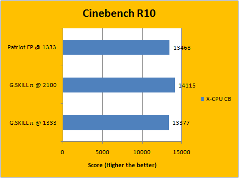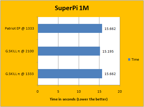 When running SuperPi calculating to one million digits, our G.SKILL Pi series RAM running at 1333MHz tied our reference Patriot Extreme Edition memory running at the same operating frequency. However, the SuperPi result above shortened 3.1% to 15.195 seconds with the G.SKILL Pi series running at 2100MHz DDR -- that's from a 2.6% increase in clock speed combined with increased base clock and memory bandwidth. It's clear what plays the bigger role here, but hey, benchmark results are benchmark results!