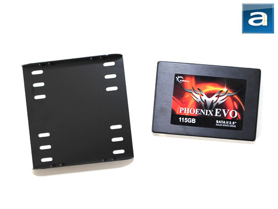 Since there probably is not too much we can write about a solid state drive -- especially when it comes to the physical aspect of it -- let us quickly cover it before we move onto the technical aspects and benchmark results. The G.SKILL Phoenix EVO 115GB is quite standard in terms of design. It features an aluminum housing to enhance heat dissipation, with a side benefit of being incredibly lightweight for what you get. On top of the brushed aluminum finish is a large label across the center to ensure the user will make no mistake that this is an G.SKILL Phoenix EVO 115GB drive. Measuring in at 100 x 70 x 9 mm, these are pretty much standard dimensions for a 2.5" internal drive. It is also quite lightweight, as you would expect from an SSD. G.SKILL Phoenix EVO drives will have no problems fitting into your laptop hard disk bay if you want to boost mobile computing performance, but if you want to use it in your desktop and your chassis has no 2.5" mount, a 3.5" adapter bracket is included right out of the box, so you can easily install this SSD in any standard desktop internal drive bay. This makes the Phoenix EVO quite convenient to deploy in either environments for the end user. My only complaint is that the screw holes on the 3.5" adapter bracket is slightly smaller compared to the ones found on standard 3.5" hard drive, so if you need to use any other screws other than the ones provided by G.SKILL (Such as, if your are installing the Phoenix EVO into a 3.5" drive bay that require screws provided by your chassis manufacturer due to use of vibration dampeners) then you will need to find your own solution.