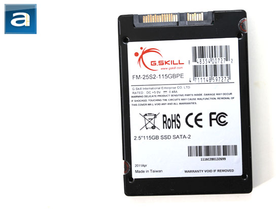 Turning the SSD around reveals a black painted metal backplate to color-match the rest of the drive. As shown in our photo above, you will find a large label with the usual series certification logos and warning statements, along with information on drive model and capacity. In case you missed it, our particular unit is the G.SKILL Phoenix EVO 115GB with part number FM-25S2-115GBPE, haha. I believe the group of numbers underneath the bar code is the serial number. Our particular unit is Made in Taiwan in April 2011, so it is pretty much fresh from the factory to our door.