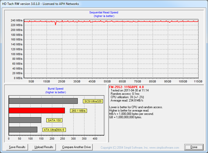 After giving the G.SKILL Phoenix EVO 115GB a clean format and ensuring alignment and everything is correct, I fired it up for some testing in HDTach. As it is to our expectations, the results came out to around 230MB/s -- absolutely identical to both the OCZ Vertex 2 160GB 25nm and OCZ Vertex 2 60GB 34nm SandForce based SSDs we have reviewed in the past. Actually, the average read speed turned out to be about a megabyte faster than its close cousins, but it would probably even out if the tests were run again anyway.