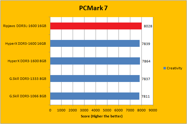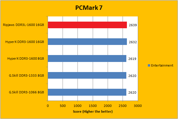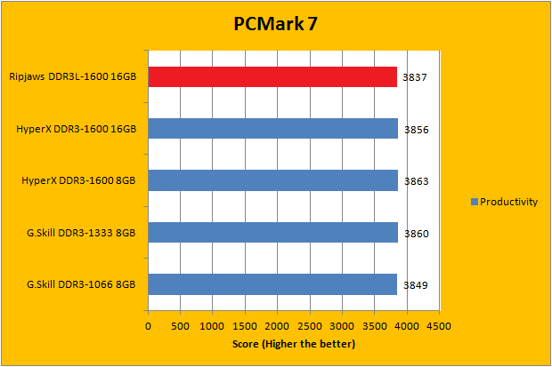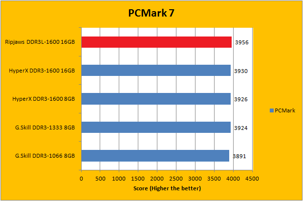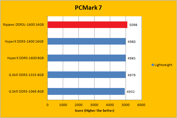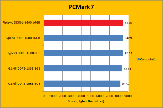 PCMark is a favorite benchmarking program for PC enthusiasts and reviewers alike, because it provides a very easy way to measure performance of different computers. It evaluates a system from seven perspectives (We only included the first six results, since the HDD test is not very relevant to a RAM review), and can be considered a synthetic real life benchmark. In the latest version of PCMark, Futuremark claims they have brought down the variance of each run to ensure accuracy of their benchmarks, and with a relatively low margin of error in mind, all tested RAM came out to be extremely close. There is no consistent lead with a large margin noticed for any of the products used for comparison in this review. The G.Skill Ripjaws F3-1600C9D-16GRSL 2x8GB took its share of wins (Noted in the overall score), but as we can see with other benchmark results in this review, it did not sweep the table.