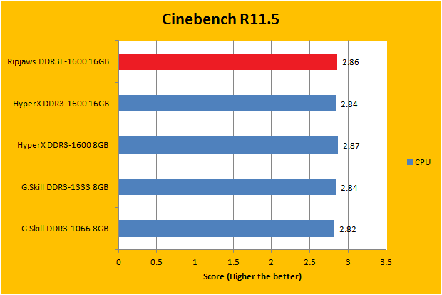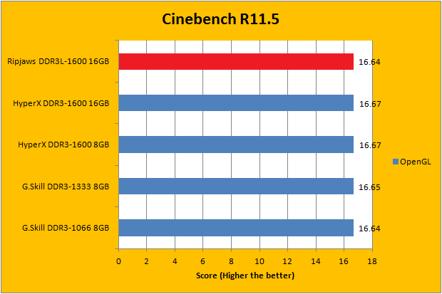 Usually, it is safe to say for Cinebench 11.5 results; higher bandwidth memory will result in performance increase. As you can see in our graphs above, it seems the formula is a little bit more complicated than this, because there are no real rules of which they go by. Obviously, they came in extremely close to each other. On the other hand, for the small gaps that separate one product from another, the G.Skill Ripjaws F3-1600C9D-16GRSL 2x8GB came in second for the CPU test, right behind the Kingston HyperX DDR3-1600 8GB, but ended up ahead of the Kingston HyperX DDR3-1600 16GB. For the OpenGL benchmark, the Ripjaws tied for last place with its humble brother, the G.Skill DDR3-1066 8GB. Fortunately, they are only 0.03 away from first place, so we definitely cannot ding it in the context of magnitude.