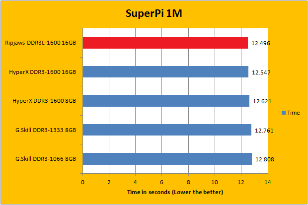 We have always included SuperPi in our benchmark results, because it is a quick and dirty run that always proves to be interesting. Our second generation mobile Core processor liked faster memory over comparable units with lower latencies, as what it seemed to be the trend since the beginning of the review. All of the numbers came in extremely close to each other, but the G.Skill Ripjaws F3-1600C9D-16GRSL 2x8GB crossed the line in first place in this tight race.