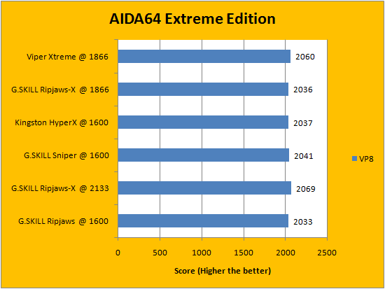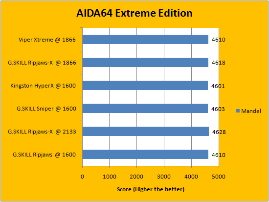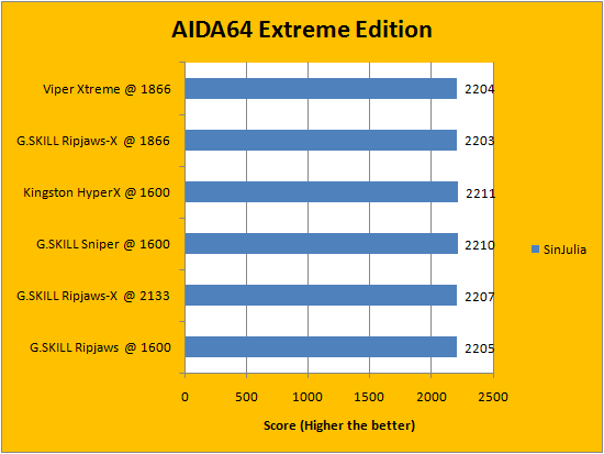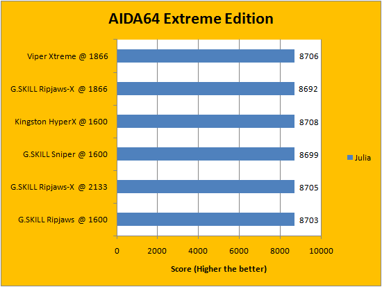 Usually, AIDA64's FPU benchmarks are the least exciting of all when writing a RAM review. This is because the way results are obtained is usually highly dependent on the tested processor; so much to an extent that the outcome is practically irrelevant to the speed or latencies of the installed memory modules. That said, it seems to us the extremely small differences between each set of RAM ended up tipping in favor of the Patriot Viper Xtreme Division 2 PC3-15000 2x4GB. Our G.SKILL Ripjaws-X F3-14900CL9D-8GBXL 2x4GB trailed slightly behind consistently, but as aforementioned, the differences are extremely small to say the least.
