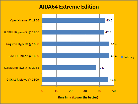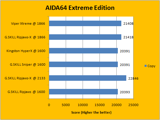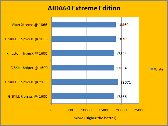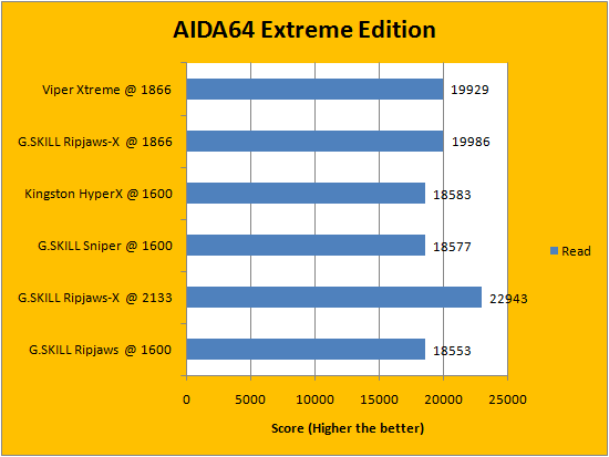 AIDA64's synthetic memory tests are the one next up to produce results for our review today. In pretty much all the benchmarks, we can see that higher memory bandwidth RAM kits are generally favored -- whether it is the Copy, Write, or Read results. This is probably the most unsurprising thing ever, consider the name of this benchmark does, in fact, reflect what is tested. Operating at DDR3-1866, it was surprising how the G.SKILL Ripjaws-X F3-14900CL9D-8GBXL 2x4GB won by a hair in all four tests against its Patriot rival. It is definitely not going to make a difference in real world usage, but we benchmark for a reason, right?