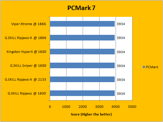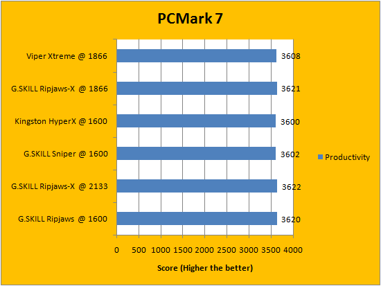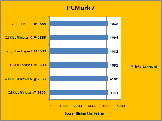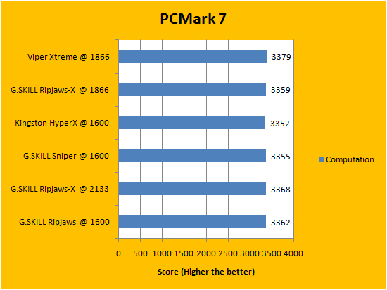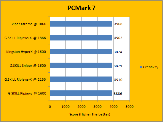 PCMark is a favorite benchmarking program for PC enthusiasts and reviewers alike, because it provides a very easy way to measure performance of different computers. It evaluates a system from seven perspectives (We only included the first six results, since the HDD test is not very relevant to a RAM review), and can be considered a synthetic real life benchmark. In the latest version of PCMark, Futuremark claims they have brought down the variance of each run to ensure accuracy of their benchmarks, and with a relatively low margin of error in mind, all tested RAM came out to be extremely close. Spots are often traded, so no clear leader can be defined.