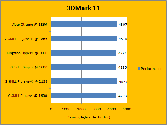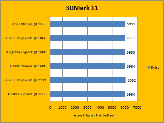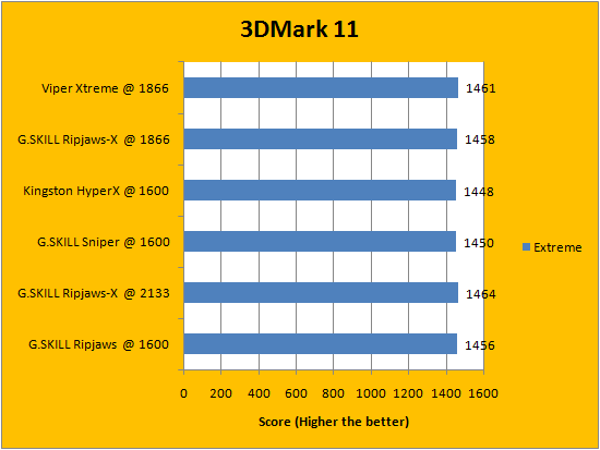 Like Futuremark's PCMark benchmarking suite, 3DMark 11 is yet another favorite among enthusiasts and reviewers alike. The latest iteration of 3DMark is available in three presets; separated into their respective categories of Entry, Performance, and Extreme. Entry is run at a resolution of 1024x600, Performance at 1280x720, and Extreme at 1920x1080. Being a relatively new benchmark on the market, Futuremark's latest program is more than capable of driving current generation graphics cards to its knees. And it did. It takes advantage of new DirectX 11 features such as tessellation, compute shaders, and multi-threading. With the Entry and Performance preset, the G.SKILL Ripjaws-X F3-14900CL9D-8GBXL 2x4GB took a small lead, but once we got to the Extreme preset, the Patriot Viper Xtreme Division 2 PC3-15000 2x4GB won by an astonishing small, three point margin.