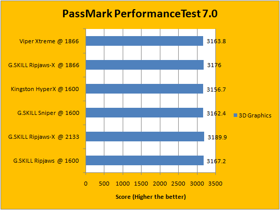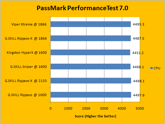 PassMark PerformanceTest is an integral benchmarking program to our battery of standard performance evaluation software collection here at APH Networks. It takes a somewhat different approach in obtaining results compared to other programs, which is why we like to use it, haha. The G.SKILL Ripjaws-X F3-14900CL9D-8GBXL 2x4GB bested its main rival in this review, the Patriot Viper Xtreme Division 2 PC3-15000 2x4GB, in three out of four tests -- again, but a very small margin; possibly due to better latencies. On the other hand, the Patriot kit still performed very consistently; it barely edged out the Ripjaws-X in the CPU benchmark.