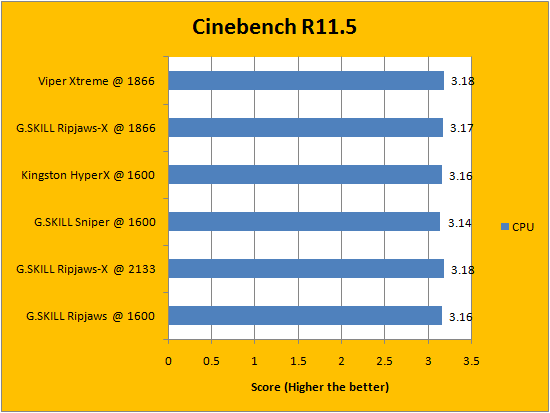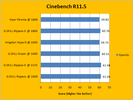 Similar characteristics can be noticed in our Cinebench results; higher bandwidth memory benefited to a very small extent, as shown in our graphs above. For the CPU test results, processor horsepower played a much more significant role in contributing to the score. This probably does not come at a surprise to you. On the other hand, things are slightly different in the OpenGL benchmark; where memory speed did not make much difference, as latencies also contributed to this score.