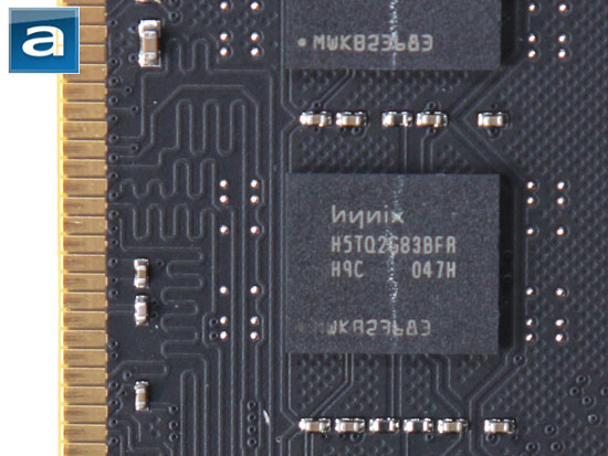 A closer look at the memory chips on the G.SKILL Ripjaws-X F3-17000CL9D-8GBXLD 2x4GB dual channel memory kit. The photo above should be quite clear -- it says "H5TQ2G83BFR" on each IC. These are Hynix manufactured chips, with eight 256MB chips on each side for a total of 4GB on each DIMM. As mentioned on the previous page, these RAM modules run at a frequency of DDR3-2133 with 9-11-9-28 latencies at 2T command rate. Since these RAM are designed for Core i5/i7 processors, they operate at a stock voltage of 1.65V.