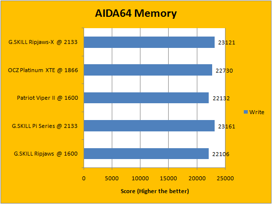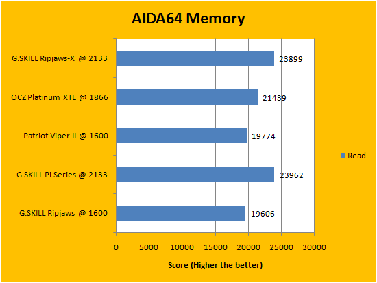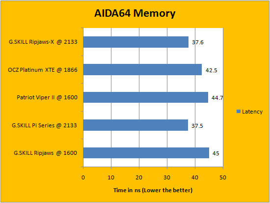 AIDA64's synthetic memory tests is the one next up to produce results for our review today. In pretty much all the benchmarks, we can see that higher memory bandwidth RAM kits are generally favored -- whether it be the Copy, Write, or Read results. One thing to point out is the Latency benchmark of AIDA64 is affected by both bandwidth and timings, so in case two sets of RAM run at the same speed, usually the one with the lower latency wins. The G.SKILL Pi Series 4GB tested runs at 7-10-10-28 compared to the Ripjaws-X 8GB's 9-11-9-28, so the results are unsurprising to say the least.