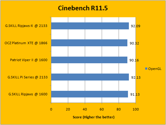 Similar characteristics can be noticed in our Cinebench results; higher bandwidth memory benefited as shown in our graphs above. For the CPU test results, processor horsepower played a much more significant role in contributing to the score. This probably does not come at a surprise to you. On the other hand, things are slightly different in the OpenGL benchmark; where memory performance did make a slightly bigger dent -- although it is still no more than two points on the charts.