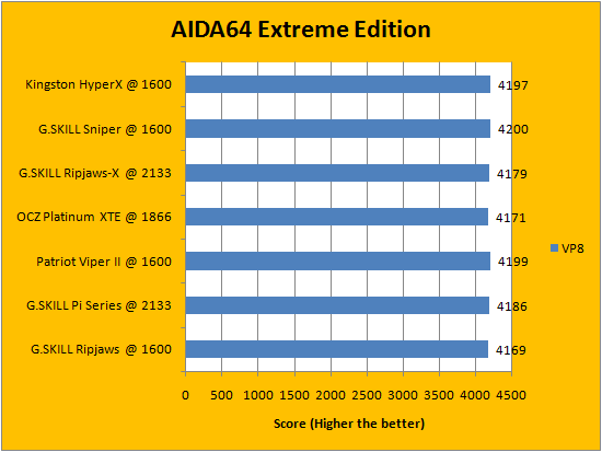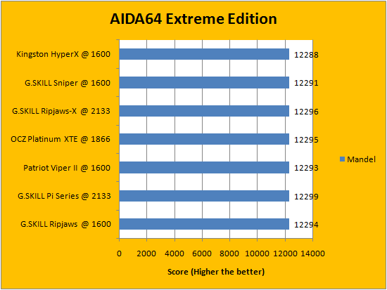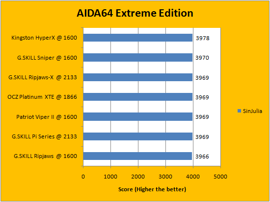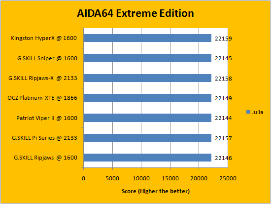 Usually, AIDA64's FPU benchmarks is the least exciting of all when writing a RAM review. This is because the way results are obtained is highly dependent on the tested processor; so much to an extent that the outcome is practically irrelevant to the speed or latencies of the installed memory modules. We publish the numbers for your interest anyway, but keep in mind any difference you see in our charts above is well within our margin of error.