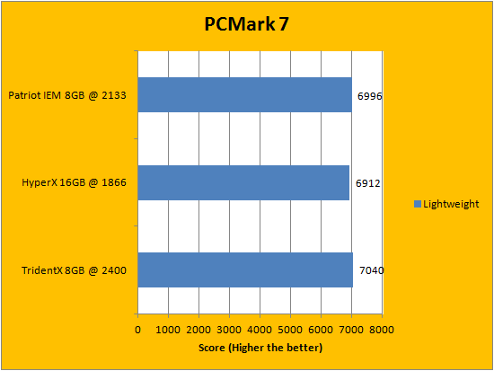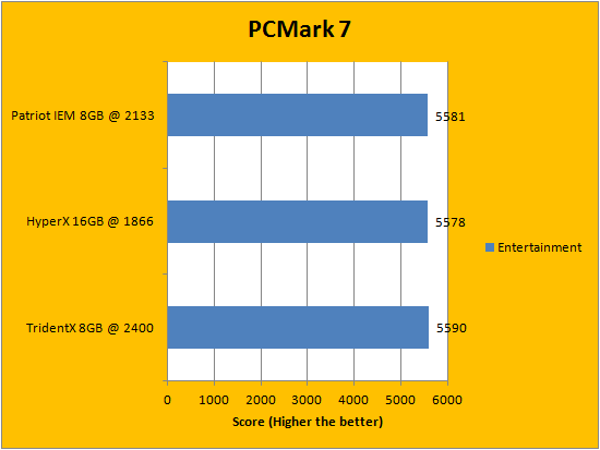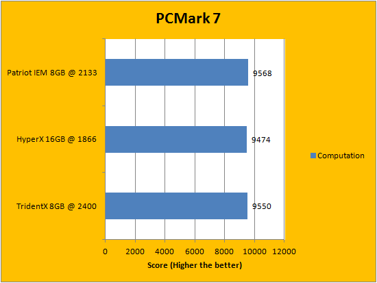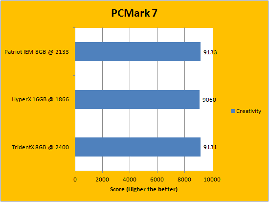 PCMark is a favorite benchmarking program for PC enthusiasts and reviewers alike, because it provides a very easy way to measure performance of different computers. It evaluates a system from seven perspectives (We only included the first six results, since the HDD test is not very relevant to a RAM review), and can be considered a synthetic real life benchmark. In the latest version of PCMark, Futuremark claims they have brought down the variance of each run to ensure accuracy of their benchmarks, and with a relatively low margin of error in mind, all tested RAM came out to be extremely close. If we were to go by absolute values, however, the G.Skill TridentX F3-2400C10D-8GTX 2x4GB and Patriot Intel Extreme Masters PC3-17000 2x4GB both put out a pretty good fight -- with each set claiming a win in three tests each. While the Kingston HyperX Predator KHX18C9T2K2/16X 2x8GB, the dual channel set with the largest capacity but lowest frequency, cannot claim a lead in any of the six criterias, it certainly wasn't far behind at all. I will let you interpret the data in our graphs above.