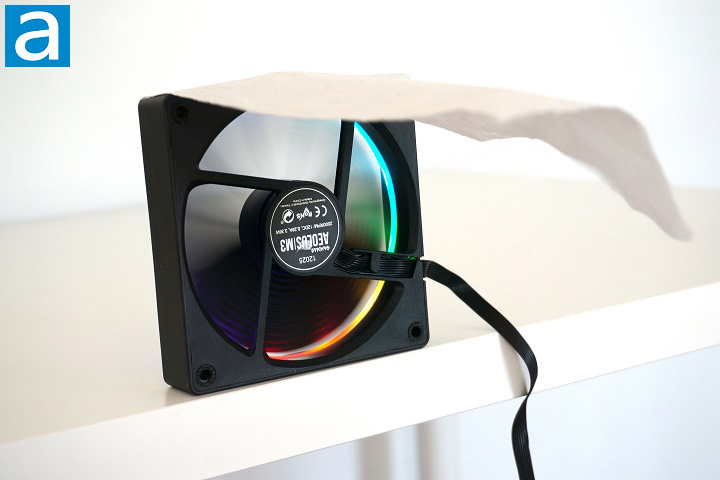 To test the performance of the GAMDIAS AEOLUS M3-1204R, the proprietary testing method invented right here at APH Networks was used. This idea allows you to test your fans at a minimum cost: A piece of tissue paper and some tape. The test results can qualitatively indicate the airflow, airflow consistency, and amount of static pressure generated by the fan. The experiment settings were straightforward. As shown by the above photos, a piece of tissue paper was attached on top of a fan. The tissue paper should be able to naturally fall down and cover the air outlet side -- the side where the motor rack is located -- of the fan. The fan under test should be put near the edge of the table, such that the experimental results will not be affected by the air reflected off the surface. Once the fans were powered on, the airflow, airflow consistency, and the amount of static pressure can be evaluated by observing the behavior of the tissue paper. Finally, the fan needs to be tested in all of its RPM ranges. In this review, only the photo of the highest RPM was shown for the AEOLUS M3-1204R, since it represents the best performance regarding the airflow and air pressure of the product.